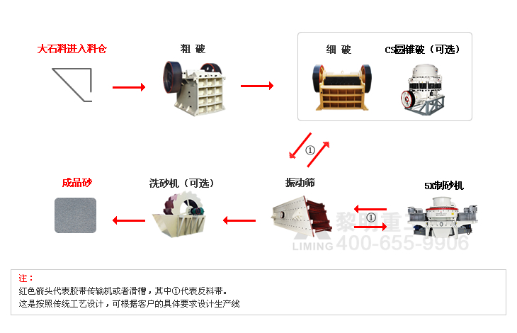 機(jī)制砂生產(chǎn)線是黎明重工歷經(jīng)數(shù)年的開發(fā)研究,將具有國際很好水準(zhǔn)的直通沖擊式破碎機(jī)(制砂機(jī))、VSI制砂機(jī)或5X新型制砂機(jī)與公司其他系列產(chǎn)品相配套,設(shè)計出的全套制砂生產(chǎn)線,專門用于人工砂的生產(chǎn),具有成品砂石粒形好、成砂率高、細(xì)度模數(shù)可調(diào)、生產(chǎn)成本低等優(yōu)點。該生產(chǎn)線特別適合于河卵石、石灰?guī)r、花崗巖、石屑等各種巖石和礦山尾礦的人工制砂。而且它還可根據(jù)不同的工藝要求,對各種型號的設(shè)備進(jìn)行組合,滿足客戶的多種需求,一線多用。